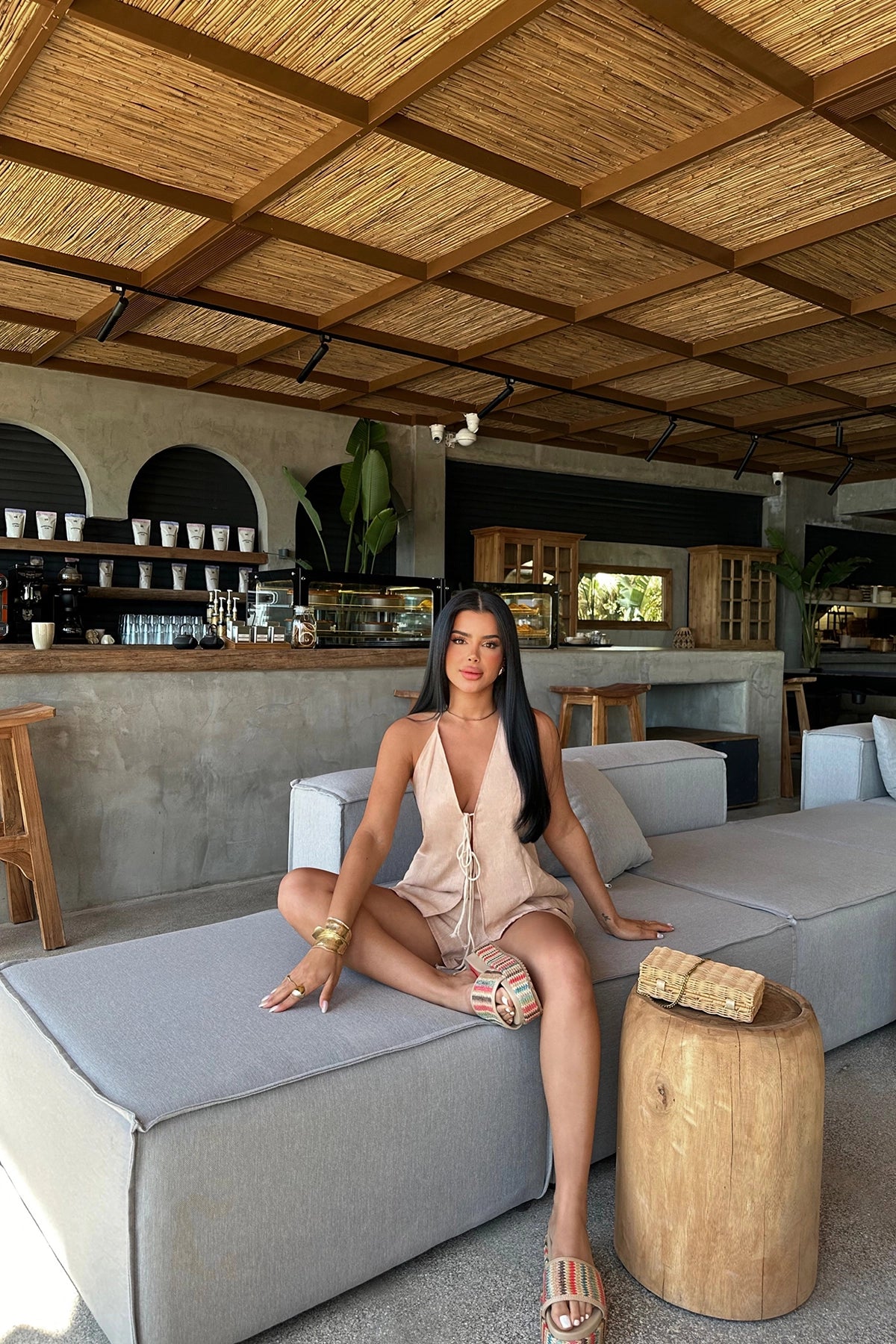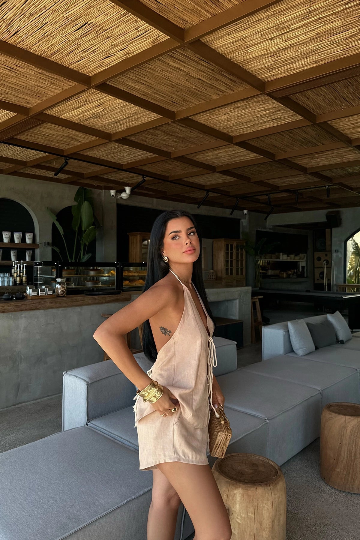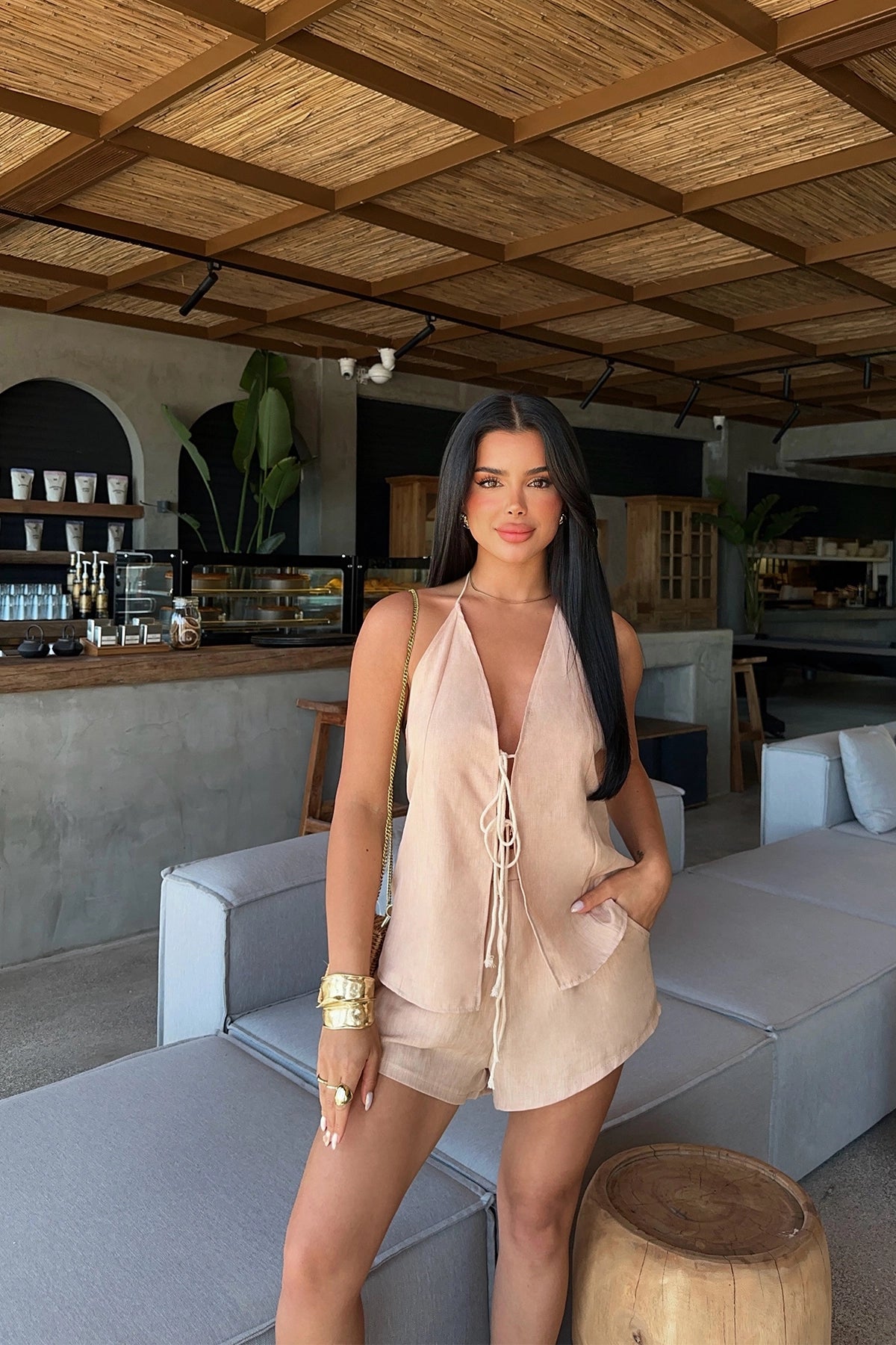 Beige Candida Linen Set Made from linen fabric. Size S is used in the image. Top length: 52 cm, Chest 36, Waist 28 cm, Bottom length 42 cm Model Measurements Height: 160 Weight: 50 Chest: 80 Waist: 62 Hip: 94