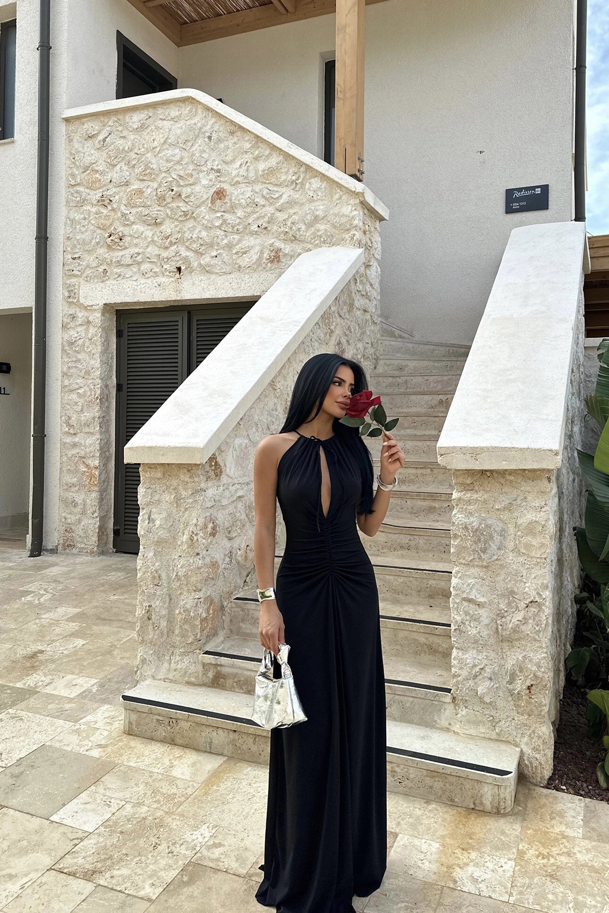 Black Albertina Low-cut Long Dress Made from sandy fabric. Size S is used in the image. Dress Length: 155cm Chest: 37cm Waist: 32cm Model Measurements Height: 160 Weight: 50 Chest: 80 Waist: 62 Hip: 94