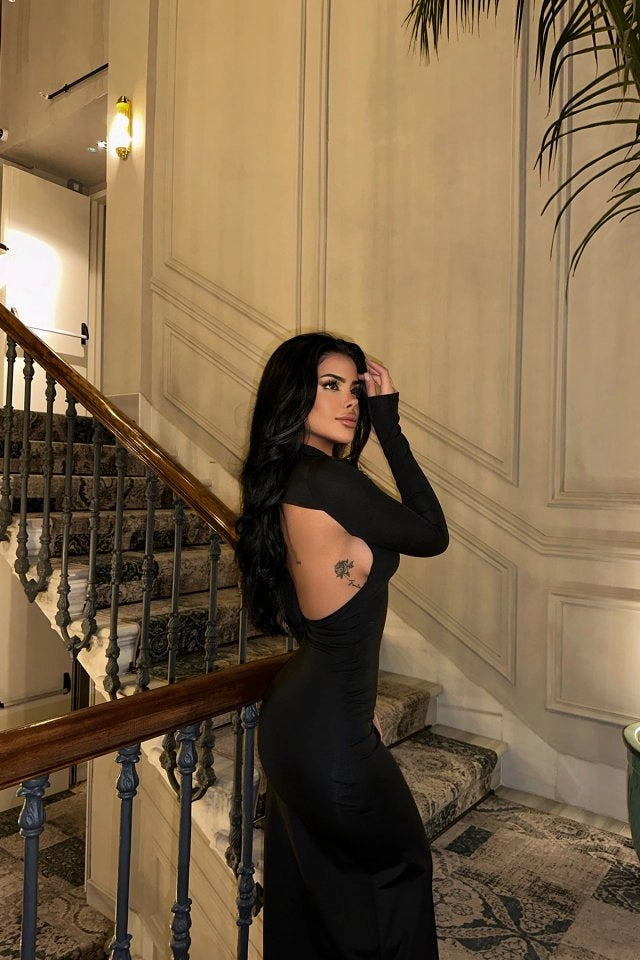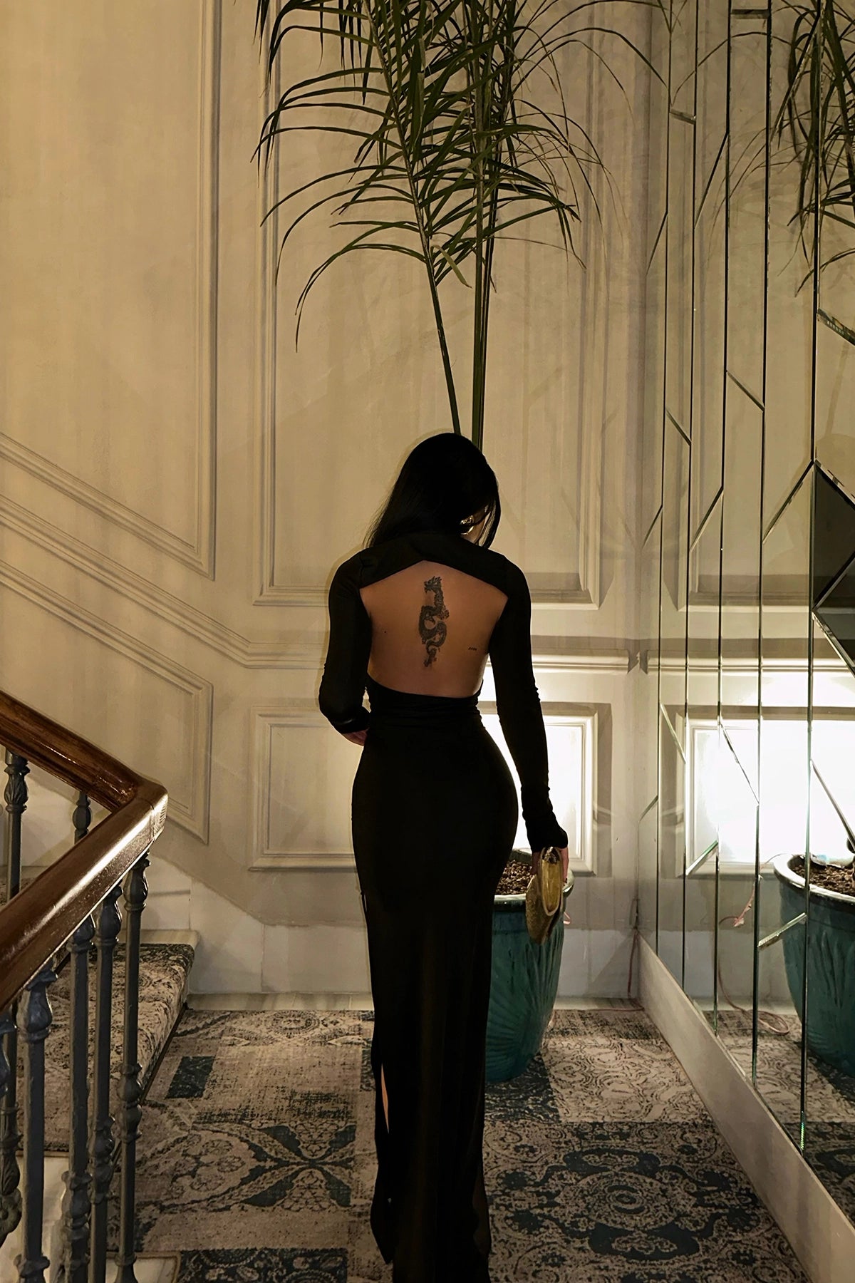 Black Long Dress with Back Detail Made of sandy fabric Size S is used in the image Dress Length: 145 cm Bust: 32 cm < p>Model's Measurements: Height: 160 Weight: 50 Chest: 80 Waist: 62 Hips: 94