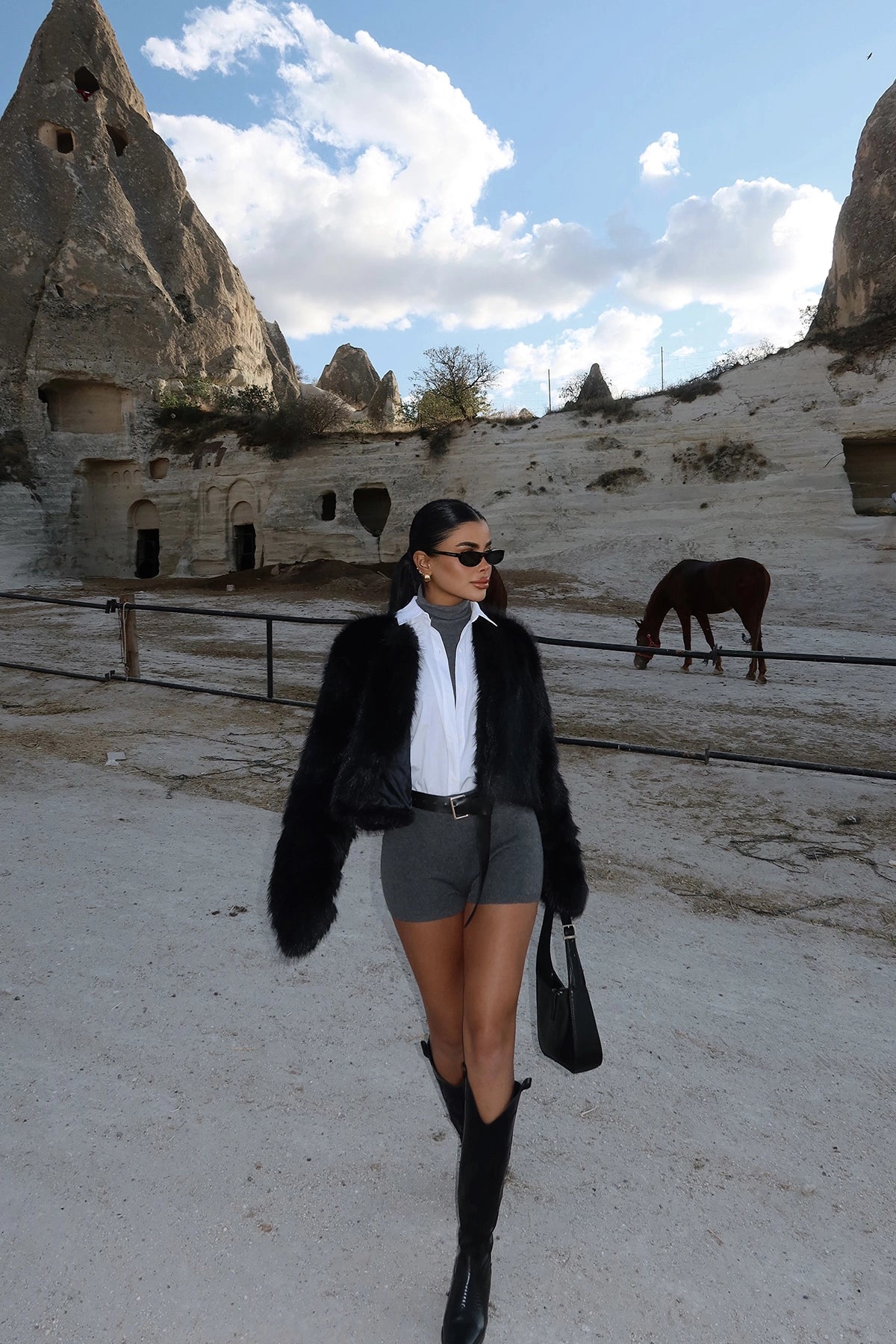 Black Leroy Fur Size XS is used in the image. Fur Length:53 Cm Chest:51 Cm Made from Lolita Fabric. Model Measurements Height 158 ​​Weight 52 Chest 80 Waist 62 Hip 93