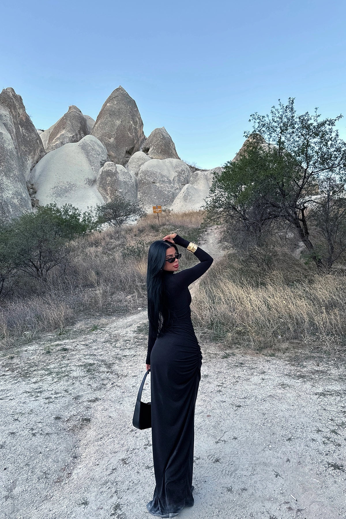 Black Long Sleeve Dress Size XS is used in the image. Made from Sandy Fabric. Height:167 Cm Waist:25 Cm Chest:32 Cm Model Measurements Height 158 ​​Weight 52 Chest 80 Waist 62 Hip 93