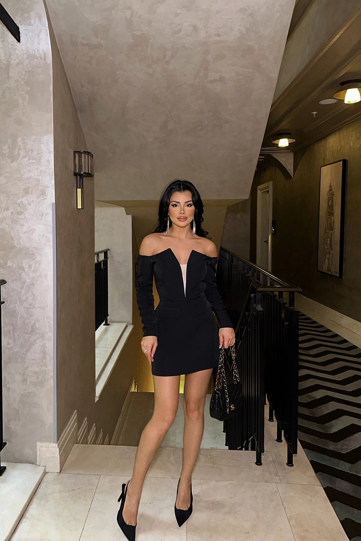 Black Lorel Mini Dress Size S is used in the image. Dress length 75 cm, Chest 40 cm, Hips 49 cm Model Measurements Height: 160 Weight: 50 Chest: 80 Waist: 62 Hip: 94