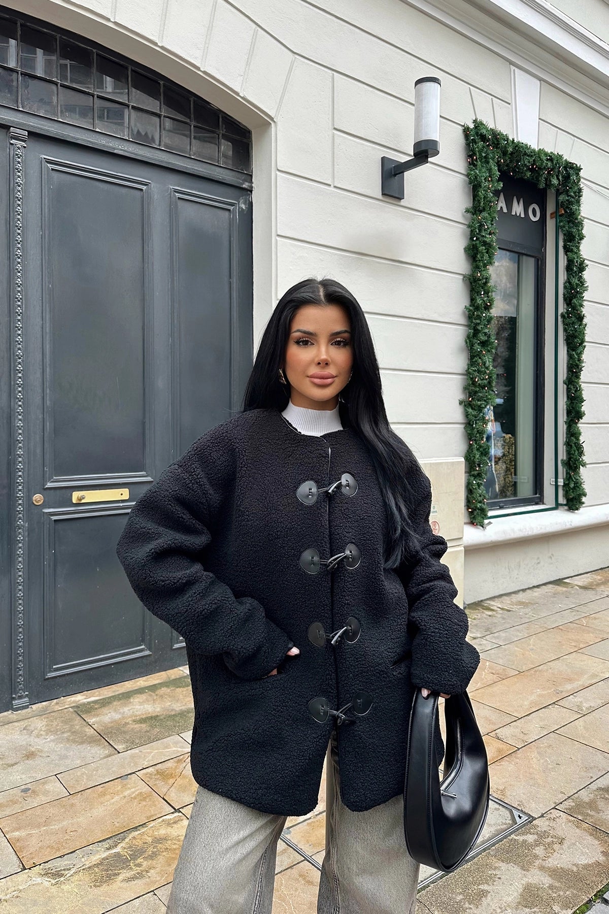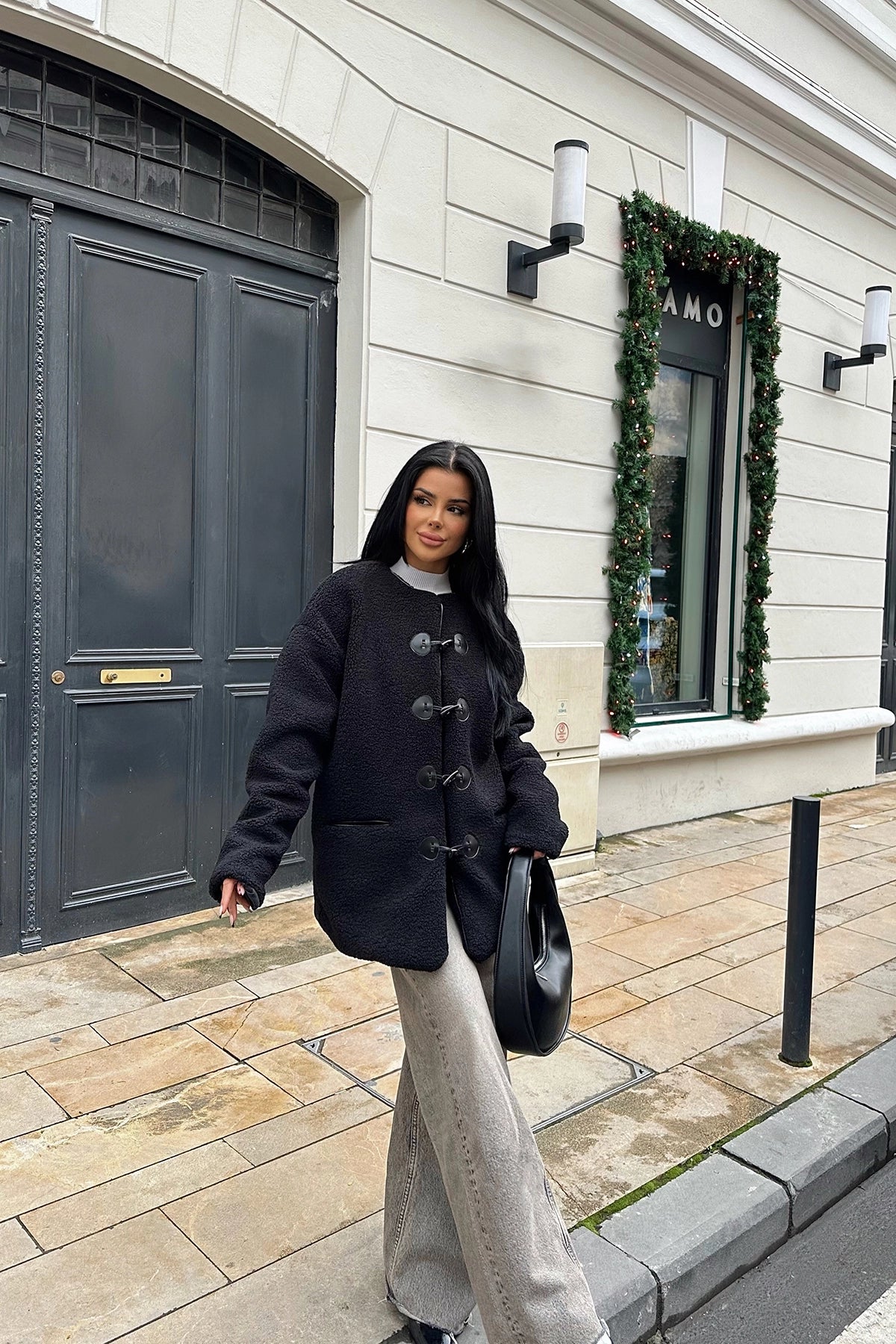Black Serenity Button-Front Coat Made from Plush Fabric Size S is used in the image Jacket Length:74cm Chest:63Cm Model Measurements Height: 160 Weight: 50 Chest: 80 Waist: 62 Hip: 94