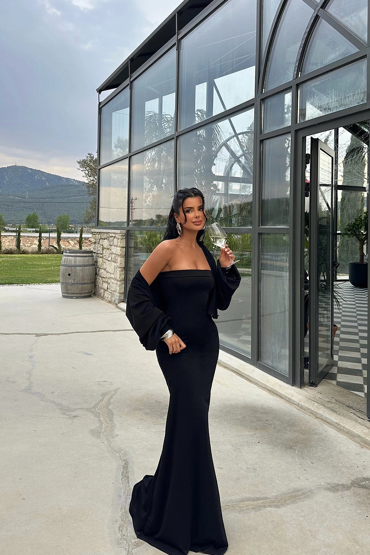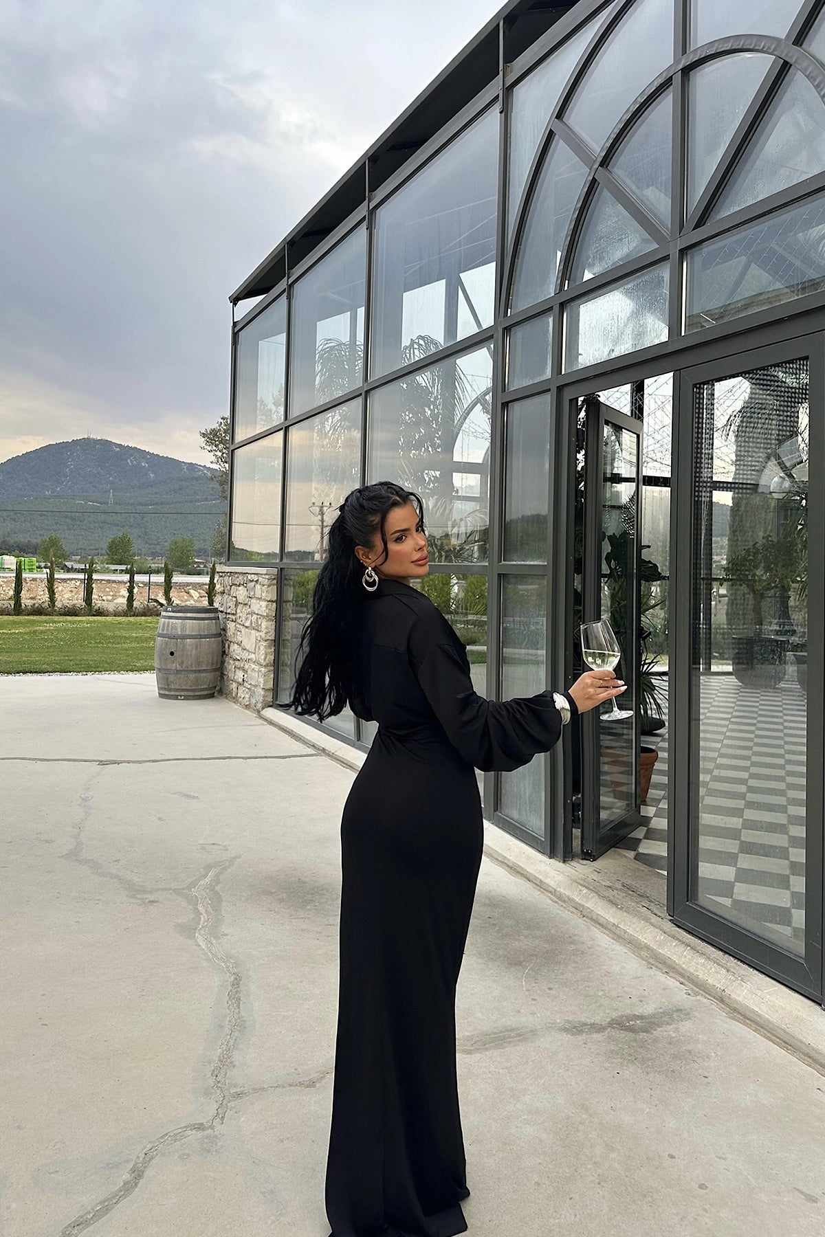 Black Shirt Collar Skirt Suit Made from sandy fabric. Size S is used in the image. Suit Shirt Length: 52 Cm, Chest: 56 Cm, Shoulder: 53 Cm Dress Length: 136 Cm, Waist: 29 Cm, Hips: 37 cm Model Measurements Height: 160 Weight: 50 Chest: 80 Waist: 62 Hip: 94